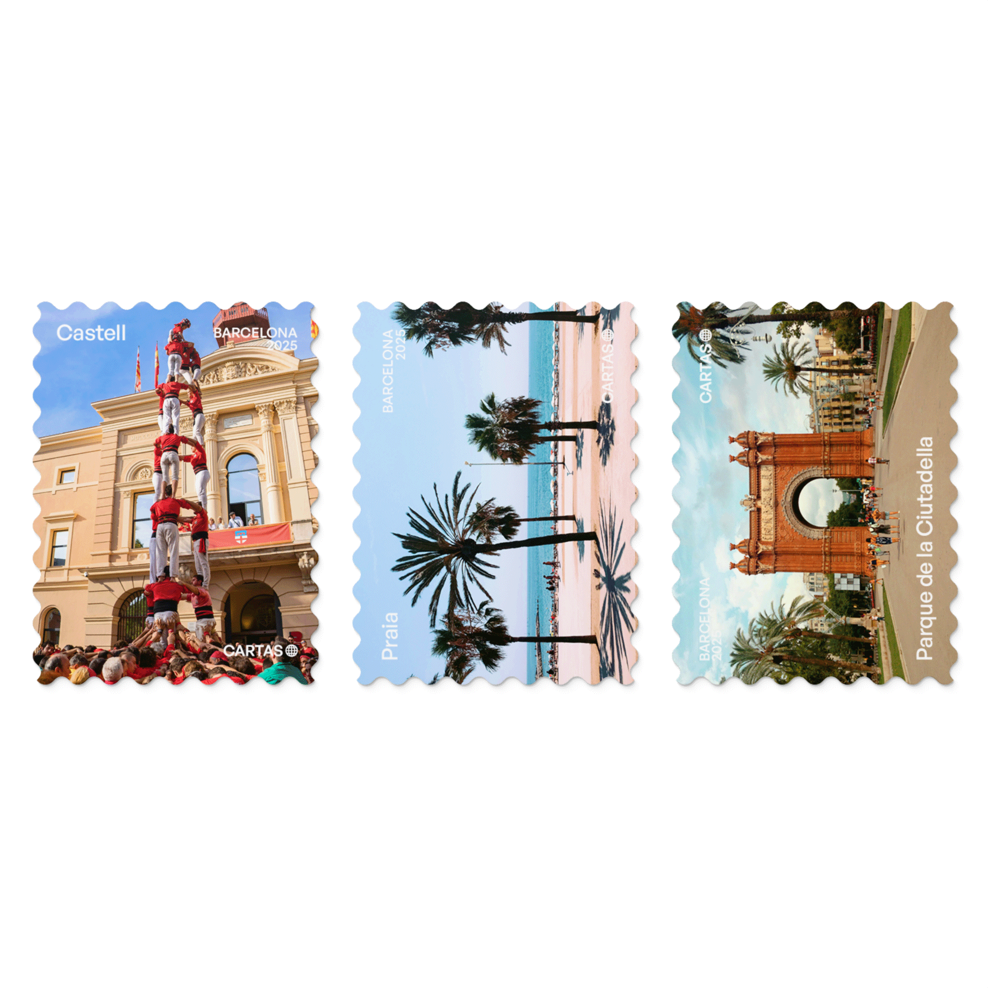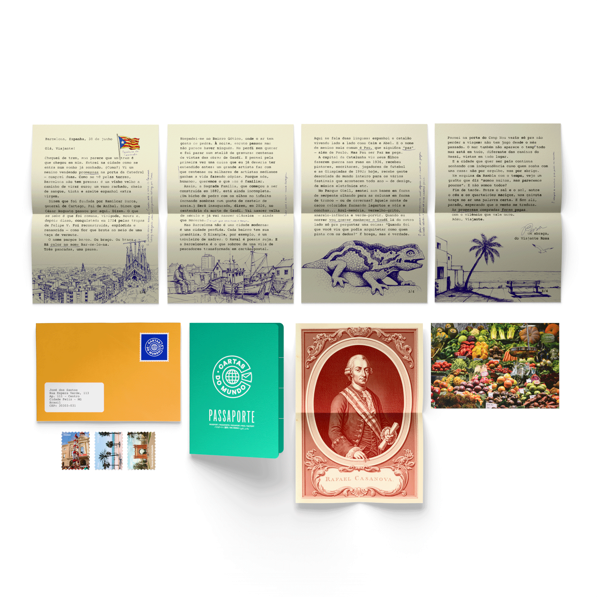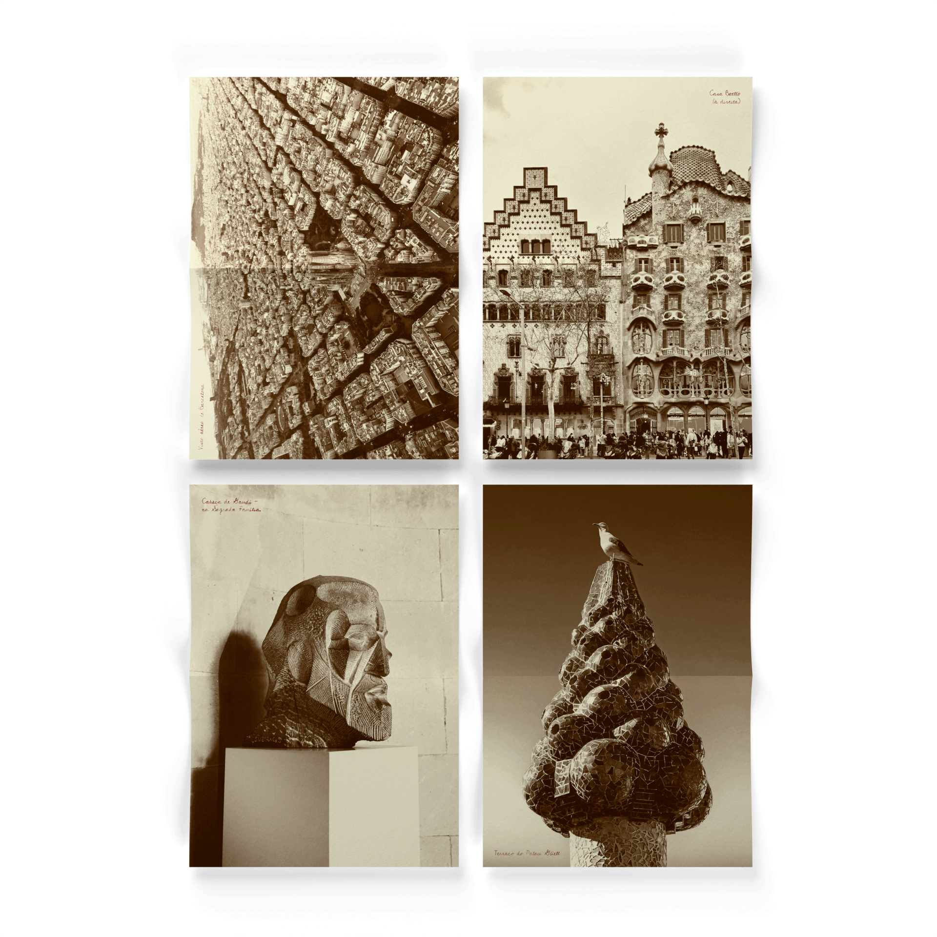 📜 1 carta de Barcelona com 4 folhas ilustradas frente e verso, convidando você a passear pela capital catalã onde modernismo é poesia, a rua é palco e a cultura pulsa em cada esquina.
