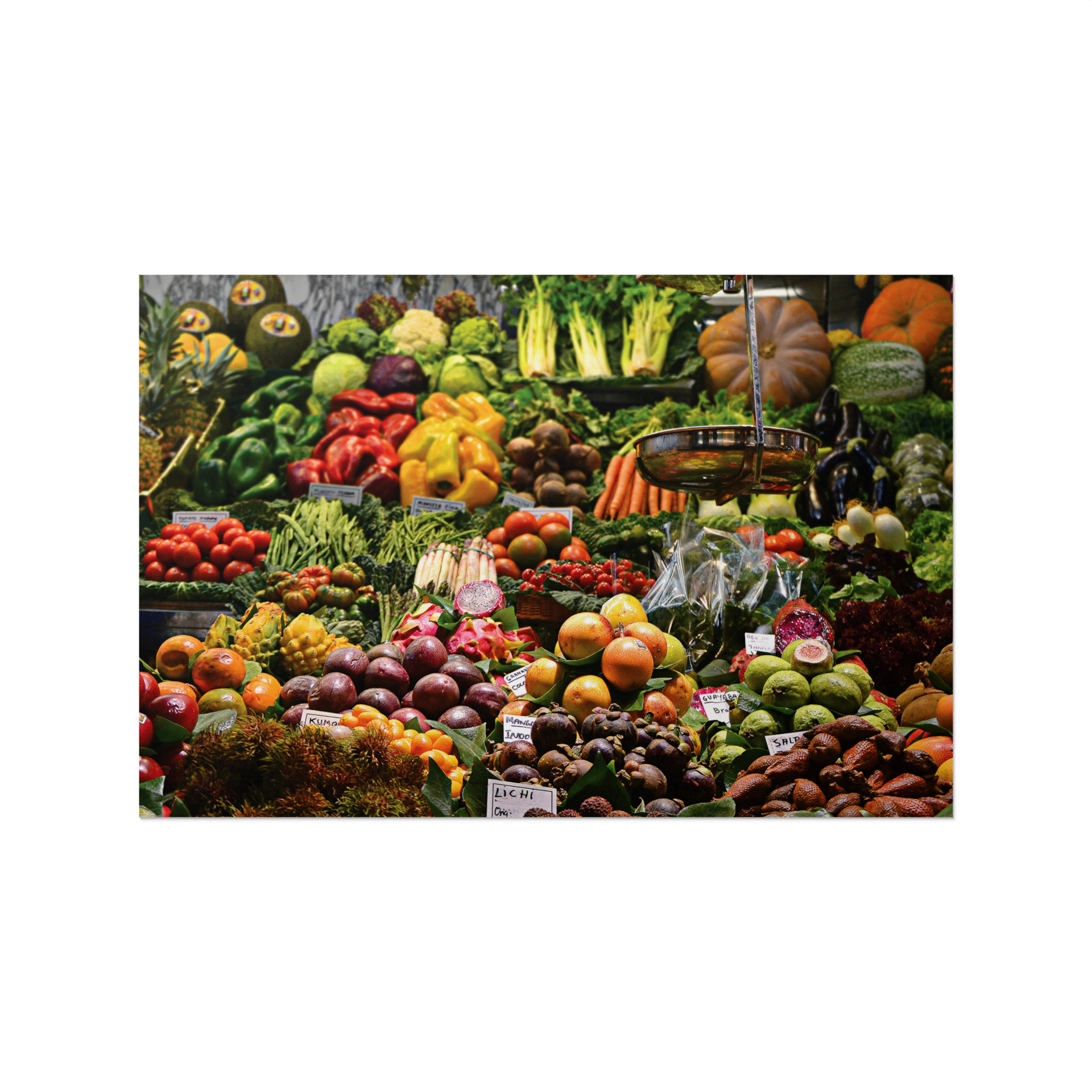 🌏 1 cartão postal de uma fruteira, em estilo vintage, celebrando as cores vibrantes e a riqueza do mercado catalão presente nas ramblas e nos bairros históricos.